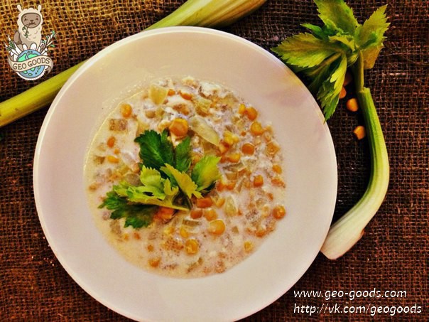 Суп подавать в глубоких тарелках, украсив кусочками обваренного сельдерея.